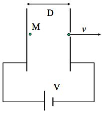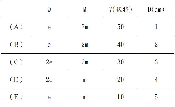 16. 圖中裝置為利用電位差 V 使一帶電粒子由正板向負板加速,若此粒子質量為 M、帶電量為 Q、正負兩板之板距為 D, 則下列組合中,何者可使此粒子經裝置加速後之速度為最大? (單選)