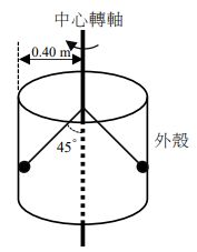 17. 調速器可用來控制馬達的轉速,其結構如圖所示、圓筒狀的外殼固定不動,中心轉軸隨馬達旋轉,軸 上兩側各有一質量可忽略的短棒,其上端與中心轉軸連接,下端各有一個質量為 1.0 kg 的擺錘,兩短棒與中心轉軸恆在同一平面,且此平面隨中心轉軸旋轉時,短棒可以自由張開或合攏,當張角為 45° 時,擺錘恰可觸及外殼;當轉速夠大時擺錘會貼著外殼,對外殼施力,以傳達馬達轉速過大的訊息。已知外殼的內半徑為 0.40 m,重力加速度 g = 10 m/s2 。若擺錘和外殼間的動摩擦係數 = 0.25,當中心轉軸的角速度維持 6 rad/s 時,任一擺錘因摩擦而損耗的功率為___________________瓦特。
