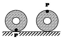 18. 一半徑為 R = 2 米的輪子沿一水平地板無滑動的滾動,如右圖所示。P 是畫在輪子邊緣的一個點,在時間 t1 = 1秒 時,P 是輪子和地板接觸的點,在稍後的時間 t2 = 5秒時,輪子轉了半圈,在這段時間 P 的平均速度為何?