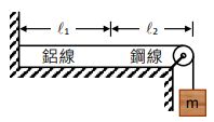19. 鋁線的長度為 = 60.0cm ,截面積為1.0✖10-2cm2,連接於截面積相同之鋼線,此複合線負荷一質量為 0.243kg 之木塊 m,如右圖所示,複合線之連接點至支持滑輪間之距離,由可變頻率之波源在線上產生橫波,當連接點為波節時,能觀察到此駐波的最低頻率為何?(鋁的密度為 2.60g / cm3 ,鋼的密度為 7.80 g / cm3 )