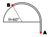 20. 如圖所示,兩質點 A、B,以長度為 π R 的細線連接,跨於一半徑為 R 的固定半圓柱光滑面上。當 B 質點放於圖上位置時,此時圓心角θ = 60° ,此質點系統恰保持平衡。現將兩質點 A 與 B 交換放置後,將此質點系統由靜止釋放,B 質點鉛直下降,A 質點順著圓柱面滑動,求 A 質點在此點的加速度量值為何?(重力加速度g =10m/s2 )