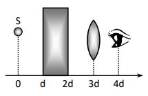 21. 物體 S 位置如圖所示,觀察者位於 4d 處,透過 3d 處的凸透鏡,以及 2d 與 d 之間,厚度 d 折射率 1.5 的玻璃磚, 所見 S 之像恰與 S 的位置重合,則凸透鏡的焦距為何?