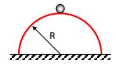 22. 如右圖所示,一光滑的半球形物體固定在水平面上,有一小球置於半球頂端,自靜止順著球面自由滑下,已知半球半徑 R,若小球與地面作彈性碰撞,則小球反跳後離地的最大高度為何?