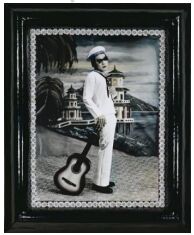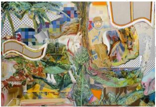 24. 這幅畫作是臺灣當代藝術家謝牧岐的作品,探究其如何面對臺灣風景繪畫的視覺文化歷史脈絡, 謝牧岐在此作中引用了幾位前輩畫家的作品,其中 不包括 下列哪一位畫家? (A)郭雪湖 (B)林玉山 (C)廖繼春 (D)陳澄波