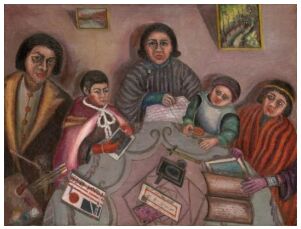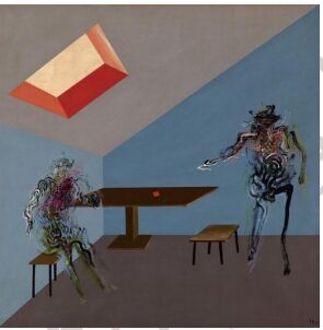 31. 請問以這幅畫作中的「毛毛人」著稱的是臺灣的哪一位畫家? (A)霍剛 (B)夏陽 (C)蕭勤 (D)李仲生
