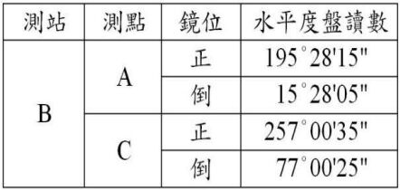 106 經緯儀觀測之結果如下,則水平角∠ABC之角度為何?(A)61˚31'20"(B)61˚32'20"(C)61˚31'30"(D)61˚32'30"。