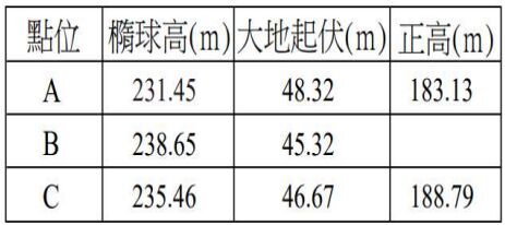 118 在某測區利用全球導航衛星系統(GNSS)進行高程測量,若在 TWVD2001 系統下,測得 A、B 及 C 三點的量測資訊如下 表所示,則 B 點正高為何? (A)193.33m(B)194.33m (C)195.33m (D)196.33m。