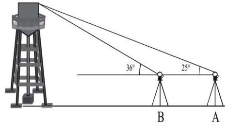 119 使用經緯儀測量一座水塔高度,觀測方式如下圖,先在此水塔前方 A 點架設經緯儀,測出水塔頂端的垂直角為 25˚,並 且水平觀測 B 點上水準尺,獲得上、中、下絲讀數分別為 1.575m、1.500m、1.425m。接著將儀器架設於 B 點上,測出水塔頂端的垂直角為 36˚,若二次架設儀器高均為 1.50m,且測設區域為一平坦地,則水塔高度為何?(註:tan25˚=0.47;tan36˚=0.73;視距常數 K=100;C=0)(A)27.115m (B)28.615m (C)19.794m(D)21.294m。