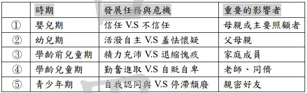 10. 艾瑞克森(Erik H. Erikson)將人生劃分為八個階段,每個階段皆有發展任務必須完成。以下有關於各階段時期的發展任務,何者正確?(A)③④⑤ (B)②③④ (C)①②④ (D)①②③。
