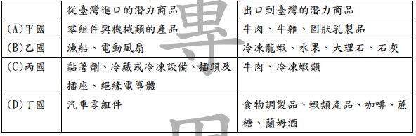 5. 近期,臺灣與拉丁美洲非島國的邦交國已陸續簽訂「經濟合作協定」(ECA)或「自由貿易協定」(FTA),進一步拓展雙方的經貿合作機會。下表為簽訂協定後,臺灣與這四國貿易潛力較高的商品。其中哪個國家與巴西、阿根廷屬於同個共同市場的成 員,因此享有關稅優惠,可作為臺商進入巴西與阿根廷市場的重要據點? (A) 甲國 (B) 乙國 (C) 丙國 (D) 丁國