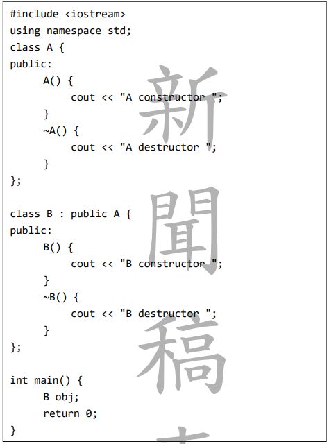 24. 下列哪一結果是以下 C++程式碼的輸出? (A) A constructor B constructor B destructor A destructor (B) B constructor A constructor A destructor B destructor (C) A constructor B constructor A destructor B destructor (D) A constructor B destructor A destructor B constructor
