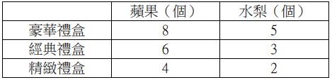 57. 某水果店推出三種不同包裝的水果禮盒,每盒內含不同數量的蘋果和水梨,下表是各禮盒與內裝的水果數量。已知王老闆購買了 20 盒不同包裝的水果禮盒,共包含了 124 個蘋果及 68 個水梨。試求他購買的「豪華禮盒」的數量。(A) 5 (B) 6 (C) 7 (D) 8