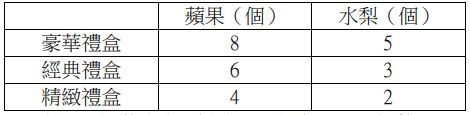 57. 某水果店推出三種不同包裝的水果禮盒,每盒內含不同數量的蘋果和水梨,下表是各禮盒與內裝的水果數量。已知王老闆購買了 20 盒不同包裝的水果禮盒,共包含了 124 個蘋果及 68 個水梨。試求他購買的「豪華禮盒」的數量。(A) 5 (B) 6 (C) 7 (D) 8