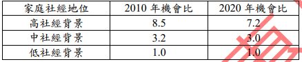 14. 某研究者對該國的高等教育階層化現象進行分析,下表為 2010 年和 2020 年不同社經背景學 生進入頂尖大學的機會比:(註:機會比為相對於低社經背景學生的比值,1.0 代表基準組) 根據上表資料,下列解讀何者最準確? (A)相較於 2010 年,2020 年的教育流動性已大幅提高 (B)教育機會均等已有顯著改善,高社經背景學生的優勢下降 (C)中社經背景家庭的教育機會提升不明顯,呈現 M 型化發展 (D)階級複製現象仍然明顯,社經背景對教育機會的影響力持續存在