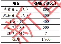 20. 下表顯示某經濟體 2023 年第一季的主要經濟數據,其中有一項資料缺失。根據國民所得會 計恆等式,表中缺失的數據應為多少? (A)100 億元 (B)200 億元 (C)300 億元 (D)400 億元