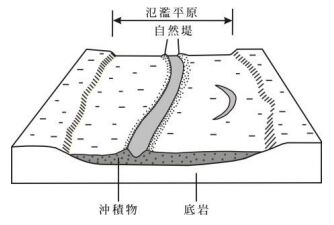 29.下圖是臺灣中學地理教科書根據國外教科書內容所引進的河流氾濫原示意圖,然而此示意圖對應到臺灣河流實況,卻發現大多數大溪流的自然堤往往離開河道有一段距離,而非圖上緊靠河道兩側,這種河流地形結構差異最適合以下列何種概念解釋?(A)河川襲奪(B)水流湍急(C)荒溪型河流(D)侵蝕基準面移動