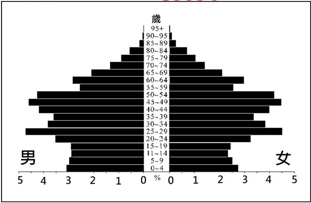 70.下圖是某國某年度的人口金字塔圖,關於該年度人口結構的相關敘述何者正確?(A)處於高齡社會(B)扶養比約為38%(C)人口轉型屬高穩定階段(D)幼年組之人口性別比為128