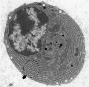 3. 人體免疫細胞中,B 細胞為受到活化後大量製造抗體的細胞,其活化時的細胞型態如下圖, 請問圖中左下角箭頭所指的虛線圓形區域是哪一種細胞內結構? (A)內質網 (B)溶酶體(Lysosome) (C)粒線體 (D)核膜