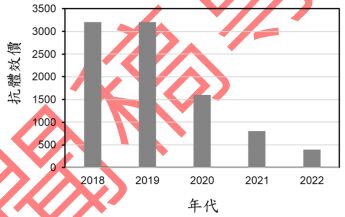 54. 科學家研究某種流感病毒 A 的免疫反應,以 2018 年感染病毒株 A 的恢復者血清,測量其對後續年份病毒株 A 的抗體效價。抗體效價測定法為使用血清進行連續稀釋,效價值表示血清在該稀釋倍數下仍具結合效果的最高稀釋倍數。根據實驗數據圖表,哪一選項最能正確解釋結果? (A)病毒株 A 因抗原漂變(antigenic drift)改變了表面蛋白的關鍵表位,使 2018 年恢復者血清中的抗體因其抗原專一性無法有效結合,導致效價下降 (B)2018 年恢復者血清中的抗體隨時間失去活性,導致其對後續年份病毒株 A 的效價逐漸下降 (C)病毒株 A 的抗原漂變誘導恢復者產生新抗體,但這些新抗體對變異株的親和力不足,導致效價下降 (D)抗原漂變使病毒株 A 的表面蛋白表位變得更加保守,使 2018 年血清抗體的效價因競爭性抑制而下降