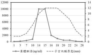 56. 一位研究人員調查人類女性月經週期的激素調控,記錄了一位健康女性的黃體酮素 (progesterone)濃度與超音波檢測的子宮內膜厚度變化,如下圖:研究人員觀察到,若黃體素濃度未能在第 15 天後上升,胚胎無法著床。根據此結果,下列哪一選項最能解釋黃體素在此週期中的作用? (A)黃體素誘導排卵,使卵子從卵泡釋放 (B)黃體素促進子宮內膜增厚,為胚胎著床做準備 (C)黃體素抑制子宮收縮,防止月經發生 (D)黃體素刺激卵巢生成更多卵泡,準備下一次排卵