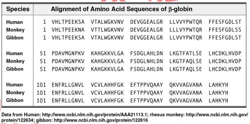 57. 此表顯示恆河猴(monkey)、長臂猿(gibbon)和人類的β-globin 蛋白序列(共 146 個胺基酸),假設序列相似度反映物種間的進化親緣關係。請根據序列比對選出正確的進化關係結論。 (A)猴子比長臂猿與人類的關係更緊密,因為猴子的β-globin 序列與人類的相同序列比例較低 (B)猴子和長臂猿都與人類無關,因為猴子和長臂猿都沒有與人類完全相同的β-globin 序列 (C)猴子和長臂猿與人類同等相關,因為它們與人類的β-globin 序列差異均小於 10% (D)長臂猿與人類的關係比猴子更緊密,因為長臂猿的β-globin 序列與人類的序列更接近