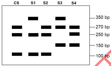 59. 在法醫 DNA 分析中,STR 標記可用於個體識別。下圖顯示了四名嫌疑人(S1、S2、S3、S4) 與犯罪現場樣本(Crime Scene, CS)在某 STR 標記上的電泳分析結果。請根據圖表判斷,哪位嫌疑人最可能是犯人? (A)S1 (B)S2 (C)S3 (D)S4