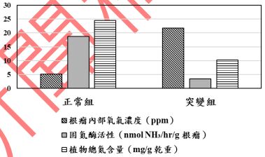 66. 研究人員為了探討卡氏帶(Casparian strip)在豆科植物根瘤中的作用,設計了一項實驗。他們選取兩組相同的豆科植物,並以相同條件培養,但其中一組植物經過基因工程處理,使其根瘤細胞的卡氏帶發育受損(突變組),另一組則為正常對照組。測量結果如下圖。根據實驗結果,可推測卡氏帶在根瘤中的主要作用為何? (A)提高根瘤內的氧氣濃度,以促進固氮酶活性 (B)阻止氧氣過度擴散,以維持固氮酶的功能 (C)增加根瘤菌的數量,以提高氮固定能力 (D)促進根瘤的水分吸收,以提升植物總氮含量