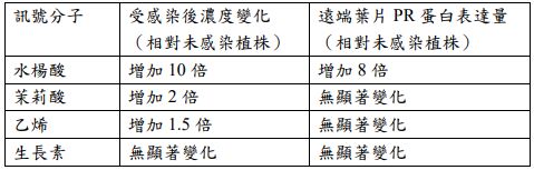 68. 科學家研究植物在受到病原體感染後的防禦機制。他們在受感染的植物中測量了不同訊號分 子的濃度,並觀察了遠端未受感染葉片中病程相關蛋白(PR proteins)的表達量。實驗數據如下表。根據以上實驗數據,以下哪種植物防禦機制最符合實驗結果? (A)局部過敏反應(Hypersensitive Response) (B)系統性誘導抗性(Systemic Acquired Resistance) (C)誘導的系統抗性(Induced Systemic Resistance) (D)物理屏障防禦(Physical Barrier Defense)