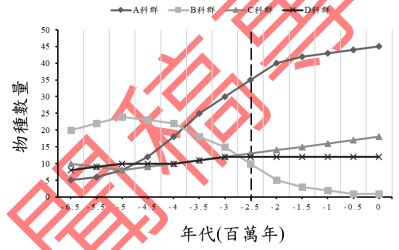 69. 下圖顯示某地區四個哺乳動物科群在過去 600 萬年間的物種多樣性變化。橫軸為時間(百萬 年前),縱軸為該科群的物種數量。請根據此圖判斷,下列哪項最可能解釋 B 科群在約 250 萬年前的顯著下降? (A)該地區因氣候變遷導致棲息環境惡化,使 B 科群難以存活 (B)A 科群在此期間物種數量快速增長,搶佔資源導致 B 科群衰退 (C)C 科群與 D 科群在此期間搶奪 B 科群的食物資源,導致 B 科群數量下降 (D)B 科群的食物資源減少,影響其數量下降