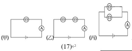 236.下列電路圖(17),燈泡、電池皆相同,則甲、乙、丙三電路圖中安培計的讀數最大的是:(A)甲 (B)乙 (C) 丙 (D)甲乙丙皆相同。