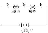 237.圖(18)為電池組和二個燈泡連接而成的電路,I1、I2、I3為流經各段導線的電流,則下列敘述何者正確? (A)I1=I2=I3 (B)I1+I2=I3 (C)I2+I3=I1 (D)I1+I3=I2。