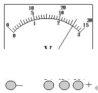 243.伏特計使用時,「+」端接在15V線柱上,板面如圖(21),則圖中的正確讀數為若干?(A)2.6V (B)13V (C)16V (D)26V。