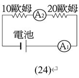 240.如圖(20),電阻器甲的電阻為6歐姆,電阻器乙的電阻為2歐姆,流經電阻器乙的電流為3A;則電池組的電壓為? (A)2 (B)3 (C)6 (D)24V。