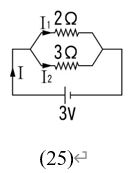 249.如電路圖(25),下列敘述何者錯誤?(A)兩電阻器為並聯連接 (B)兩個電阻的總電阻值為5Ω (C)通過 3Ω電阻器的電流為1安培 (D)電池提供的總電流為2.5安培。