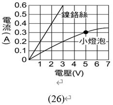250.圖(26)是一條鎳鉻絲及一個小燈泡作電流和電壓關係的實驗曲線。下列敘述何者正確?(A)電壓3V時,鎳鉻絲的電阻是0.2歐姆 (B)電壓5V時,小燈泡的電阻是15歐姆 (C)鎳鉻絲的電阻值符合歐姆定律 (D)小燈泡的電阻隨著電壓的上升而增加。