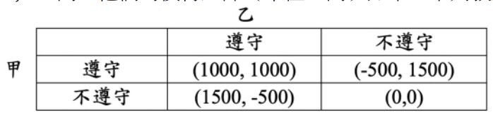 18 假設某一市場內有甲、乙兩家廠商,他們一起商議訂價規則。假設他們都遵守的話,利潤各為 1,000 萬; 都不遵守的話利潤均為 0;若一方遵守另一方打破規則,則遵守的廠商損失 500 萬,打破規則的廠商獲得 1,500 萬。他們的償付矩陣(單位:萬)如下,下列敘述何者正確? (A) Nash 均衡為(甲,乙)=(遵守,遵守) (B) Nash 均衡為(甲,乙)=(遵守,不遵守) (C) Nash 均衡為(甲,乙)=(不遵守,遵守) (D) Nash 均衡為(甲,乙)=(不遵守,不遵守)