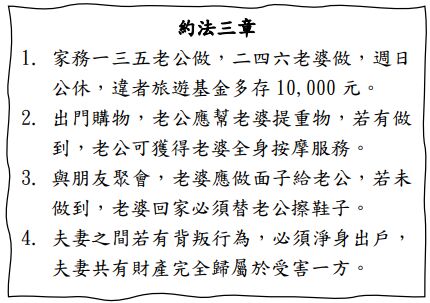 86. 附圖是某項家庭夫妻的約法三章。下列相關敘述,何者正確?
