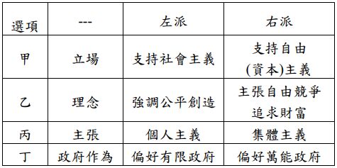 89. 1791 年法國制憲議會,溫和的保王黨人坐在議場右 邊(支持貴族利益),而激進的革命黨人則坐在左邊 (反對階級利益),從此產生「左派」、「右派」的意識之爭。關於左右兩派的比較,下列敘述何者正確?