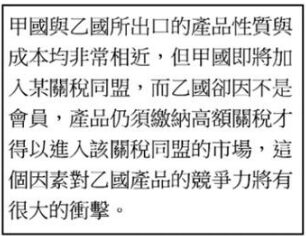 91. 下列是甲、乙二國在國際貿易競爭現況的分析,根據 內容判斷,文中所指不利乙國產品競爭力的原因,最可能是下列何者?