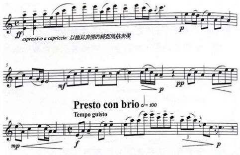100. 譜例是一首小提琴獨奏的夏康舞曲(Chaconne),請問該舞曲使用的旋律最「不」可能取自以下哪首福佬民歌的旋律? (A)六月田水 (B)五更鼓調 (C)一隻鳥仔 (D)一隻鳥仔哮啾啾