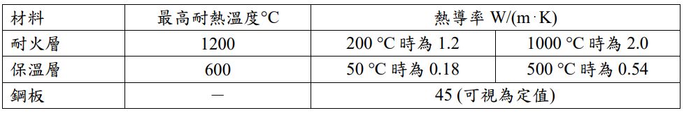 五、一座裂解爐,爐牆之平面材料結構,由內向外依序為耐火層、保溫層、鋼板(厚度0.008 m) 3 層。已知爐內溫度為 1150 °C,鋼板外層溫度為 80 °C,透過爐牆向外的熱損失為 5000 W/m²,各層材料性質如下表所示。假設各層材料間接觸良好,無接觸熱阻,熱導率 與溫度為線性關係,若要使爐牆總厚度達到最小,請計算耐火層與保溫層的厚度分別為 多少公尺(計算至小數點後第 4 位,以下四捨五入)?(15 分)