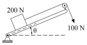 12. 如右圖所示,傾斜板上有一重200 N的物體受到一平行於板面的繩索拖曳,若繩索受100 N的力作用,物體與板面的靜摩擦係數為 0.268,則使物體不發生下滑的最大傾斜角度θ最接近下列何者?