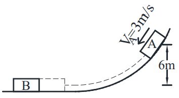 20. 如右圖所示,質量2 kg的物體A從距平面高度6 m處,以初始速度3 m / s沿光滑斜坡下滑,隨後撞上質量8 kg靜置於平面上的物體B,碰撞後兩物體結合,請問碰撞後兩物體的速度為何?