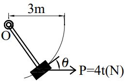 22. 如右圖所示,一質量2 kg的物體與一長度3 m的剛性桿連結,忽略剛 3m 性桿的質量,物體受外力P = 4t作用後(P的單位為N,t的單位為sec) 將繞著O點在光滑水平面上旋轉。若P的作用線與物體路徑切線的 O 夾角θ保持60度,且t = 0時,物體為靜止狀態,則當t = 6時,物體的速率為何?
