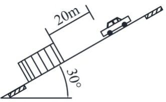 23. 如右圖所示,一質量1.5公噸的汽車停放在斜坡上,與下坡貨櫃的距離為20公尺,今汽車開始向下滑動,坡面傾斜角度30度且摩擦係數為0.2,則當汽車觸碰到貨櫃時的速度為何?