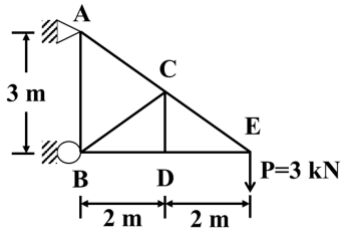 33. 如右圖所示,一桁架其彈性係數E = 200 GPa,所有桿件斷面積A均為150 mm2,於E點施加P = 3 kN的垂直向下作用力,請問AC桿之變形量為何? (A)縮短0.4167 mm (B)縮短0.2083 mm (C)伸長0.2083 mm (D)伸長0.4167 mm