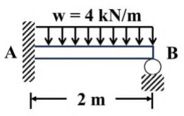 42. 如右圖所示,一靜不定梁兩端分別為固定端及滾支承,承受4 kN / m 之垂直向下均佈載重,則B點之支承反力為何?