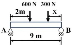 43. 如右圖所示,一簡支梁分別承受300 N及600 N兩垂直作用力,若支承反力,則X值為何?