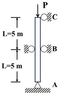 44. 如右圖所示,一軸向桿件承受一軸力P作用,A點與C點均為鉸接,桿件在中點B處有側向支撐,已知桿件斷面之I = 8000 cm4,L = 5 m,彈性係數E = 2 × 106 kgf / cm2,若另一軸斷面不會發生挫屈,則其臨界挫屈載重為何?