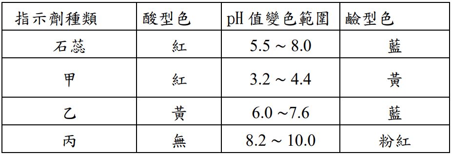 5. 某些指示劑變色範圍如下表,以石蕊為例,當 pH<5.5 呈紅色,pH>8.0 呈藍 色,某酸 0.1M,以甲指示劑測之呈黃色,以乙指示劑測之呈黃色,以丙指示 劑測之呈無色。則此酸溶液的氫離子濃度最可能為何?(pH=-log[H+ ]) (A) 10-1M (B) 10-3M (C) 10-5M (D) 10-7M。